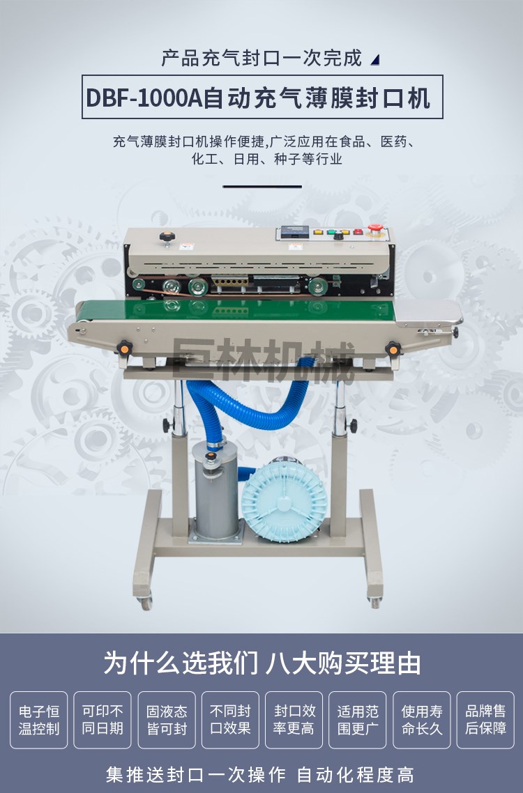 本机主要适用于膨化食品的包装,是在自动薄膜封口机改进自动充气装置后的产品,塑料薄膜经过充气包装后提高了抗碎性,减少食品在运输过程的损坏。